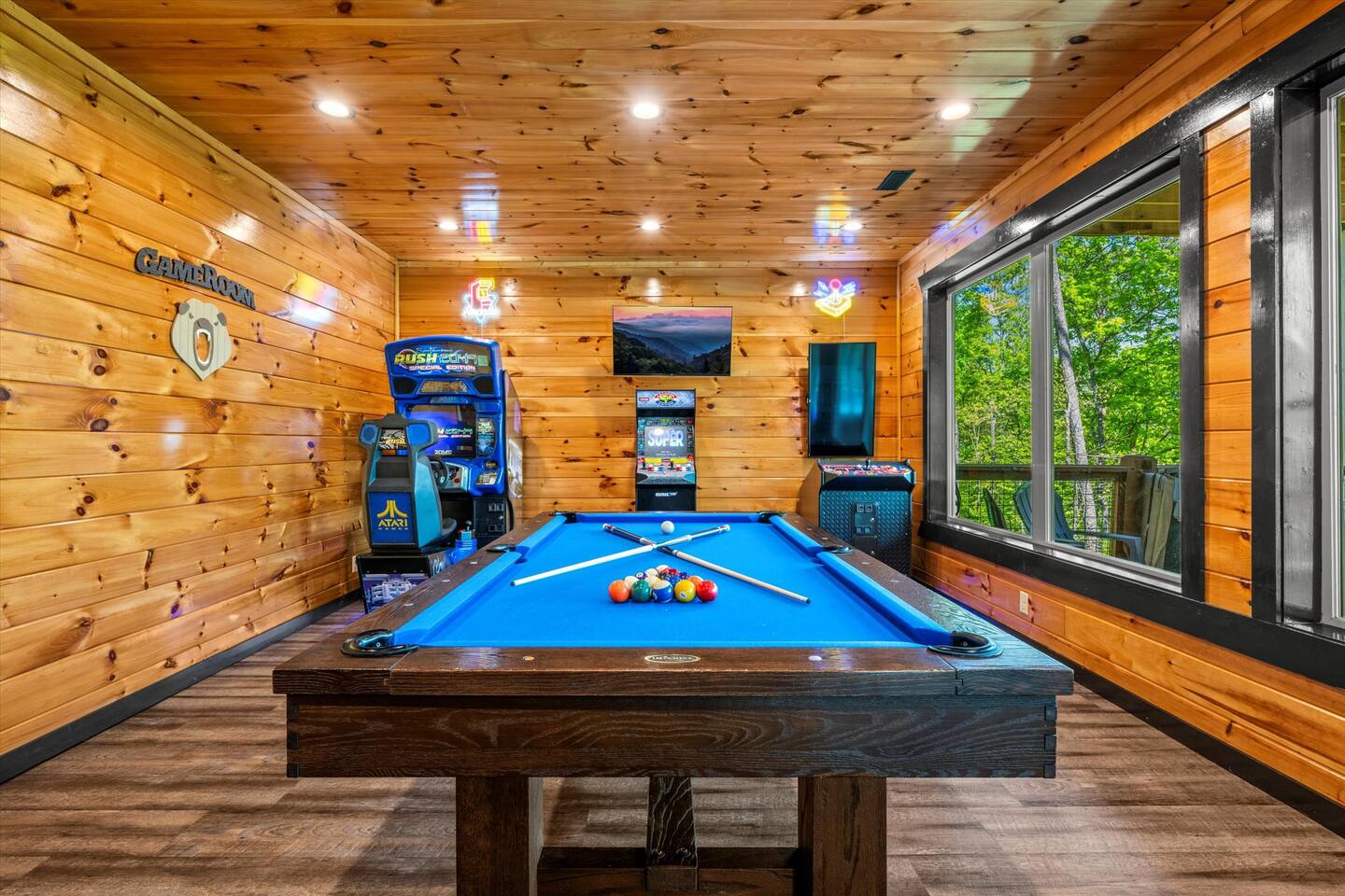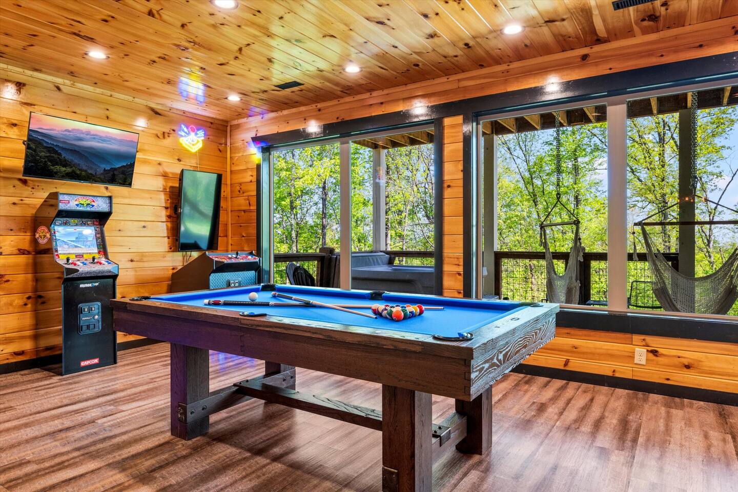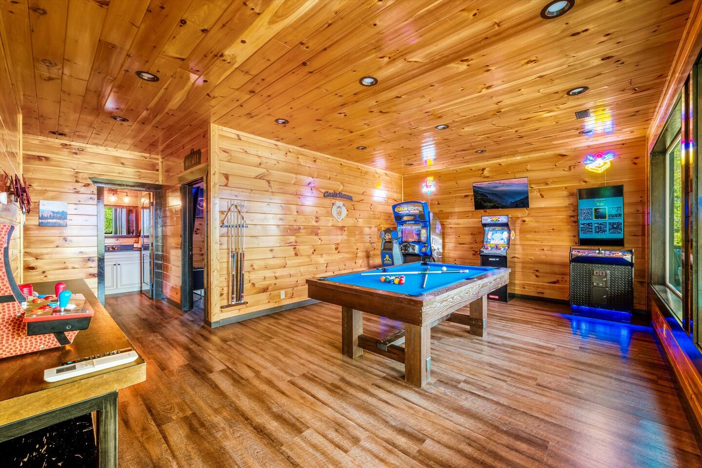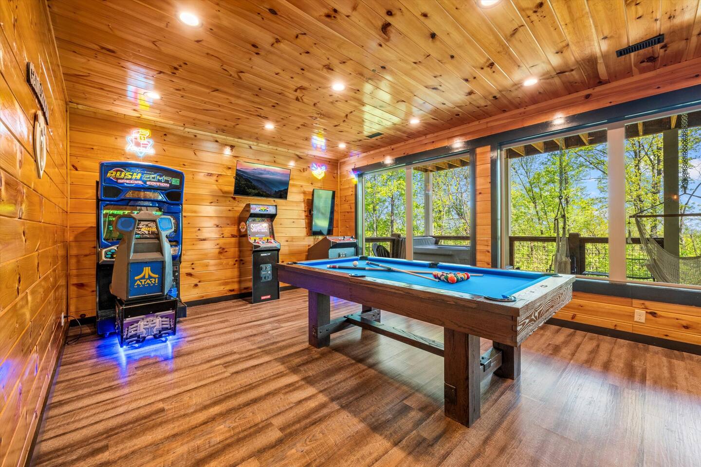 Elevate your experience with the ultimate cabin adventure, complete with arcade games, a pool table, a movie theater, and, of course, the indoor pool and hot tub. Your indulgent retreat awaits at Vacation Lovers. Secure your slice of paradise now—book your stay for an extraordinary escape!